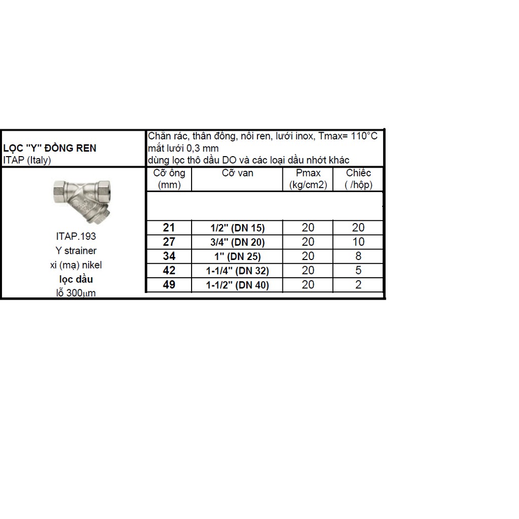 Giới thiệu Lọc Y đồng ren mạ niken Italy art.193 phi 21 phi 27