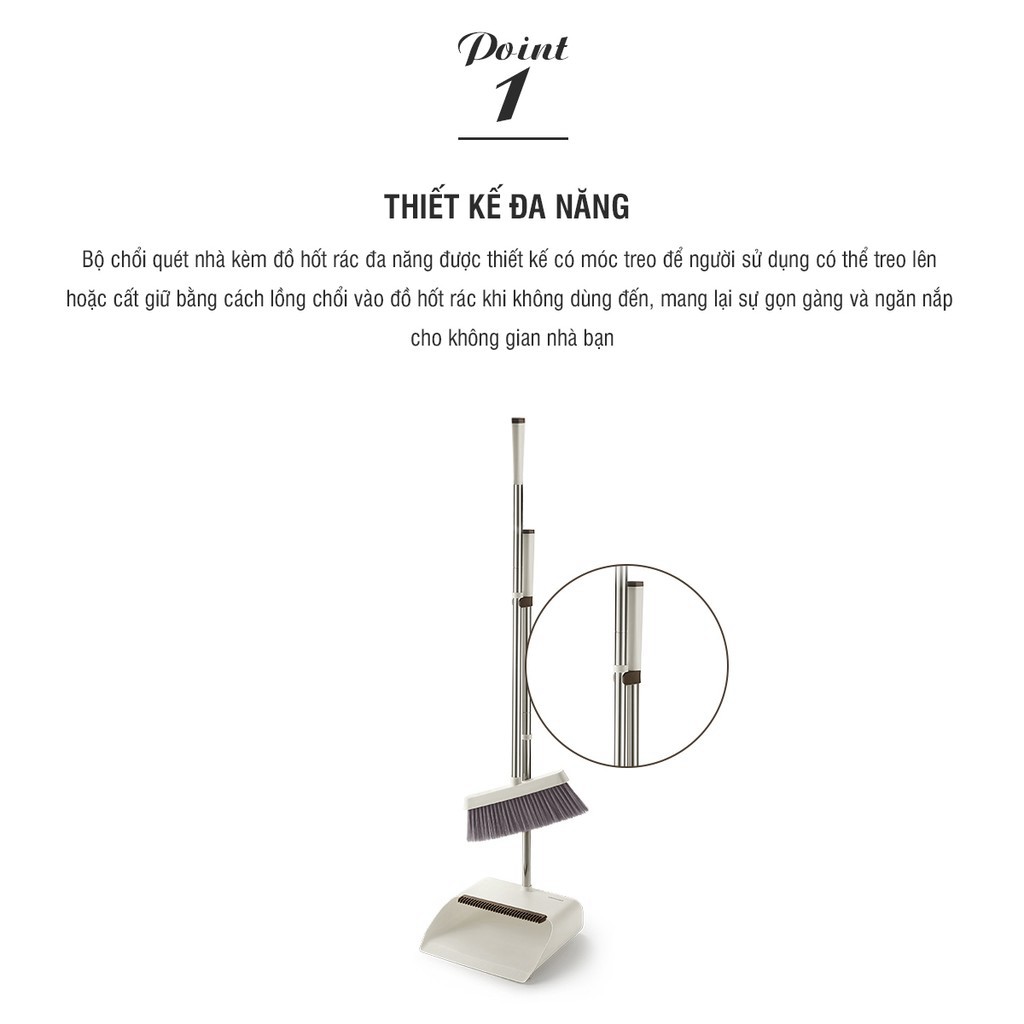 - Chổi và dụng cụ hốt có thể được gắn và tháo ra giúp cất giữ thuận tiện.
