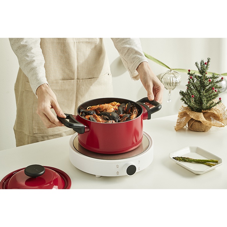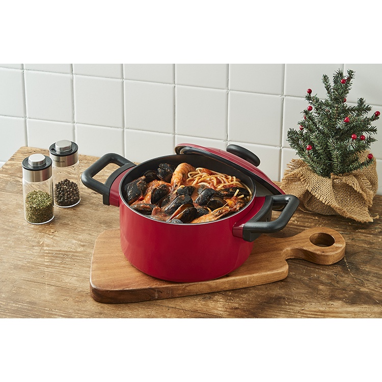 Bộ sản phẩm gồm nồi màu đỏ size 20cm, chảo sâu lòng size 22cm màu trắng kem.