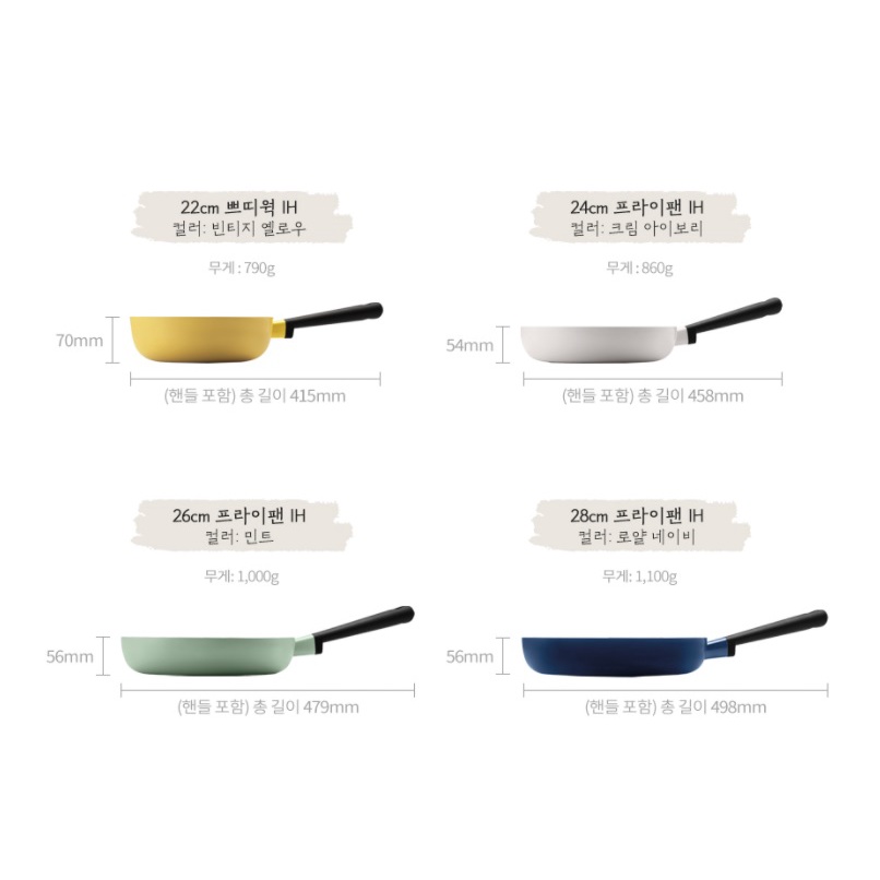Gồm nhiều size với màu sắc khác nhau tô điểm cho gian bếp nhà bạn:+ Chảo 22cm cao 7cm màu vàng (dạng sâu lòng)