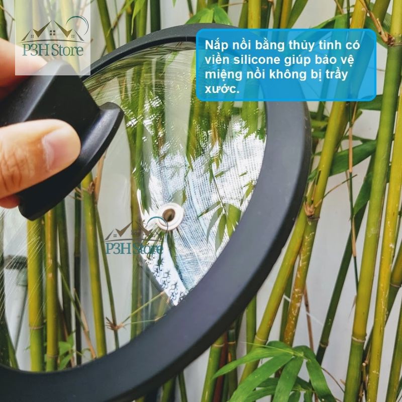 - Nắp nồi bằng thủy tinh có viền silicone giúp bảo vệ miệng nồi không bị trầy xước