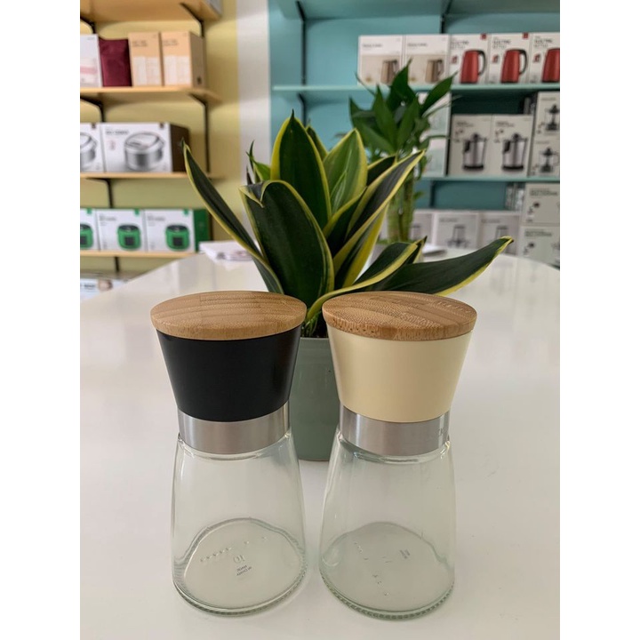 👉Chất liệu: lọ thuỷ tinh, lưỡi xay bằng sứ, nắp gỗ sồi