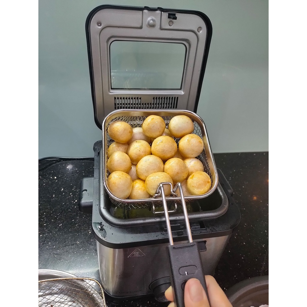 💯 Bạn có thể nâng giỏ chiên lên và làm ráo dầu nhờ vào móc tích hợp trong khi mở nắp.