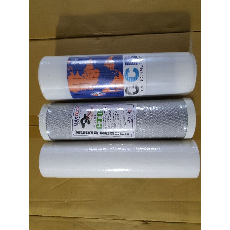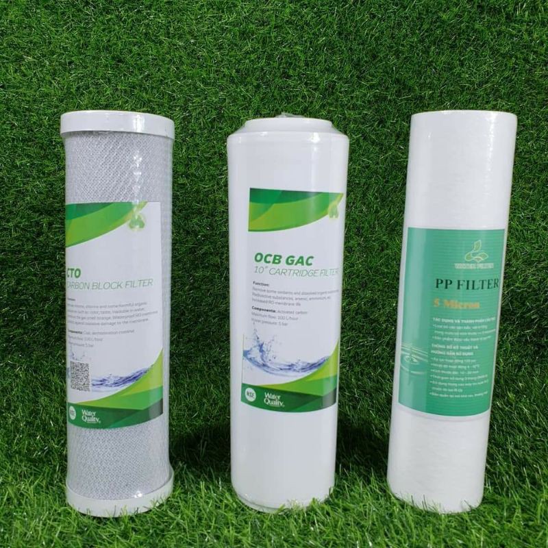 bộ lõi 123 lắp vừa các loại máy lọc nướclõi lọc số 1 - Sợi PP khe hở 5 micron Đây là lõi lọc ở vị trí số 1 trongMáy lọc nước. Ngăn chặn bẩn, bùn đất, rỉ sét có kích thước >= 5 micron. Thời hạn thay lõi số 1: Lõi lọc số 1 (PPE) : Từ 3 – 6 tháng. Trong môi trường nước máy tuổi thọ đạt ~ 4 tháng, còn trong môi trường nước giếng khoan có hàm lượng sắt, đá vôi, man gan…nhiều thì tuổi thọ từ 2 – 3 tháng. Lõi so 2 Nguyên liệu: Sợi PP có khe⁶ lọc 1 micron - Chức năng: Loại bỏ bùn đất, rỉ sét, các loại tạp chất thô, kim loại nặng ... có kích thước > 1 micron - Tuổi thọ: 9 ~ 12 tháng (~ 36.000 lít) Nguyên liệu: Than hoạt tính dạng hạt - Chức năng: Hấp phụ kim loại nặng, chất hữu cơ, chất tẩy rửa, các loại hóa chất độc hại ... Thời gian thay lõi số 2: Lõi lọc số 2 (UDF-GAC) : Từ 6 – 9 tháng. Trong môi trường nước máy tuổi thọ đạt ~8 tháng, còn trong môi trường nước giếng khoan thì tuổi thọ từ 5 -8 tháng Lõi lọc số 3 (CTO) : Từ 9 – 12 tháng. Trong môi trường nước máy tuổi thọ đạt ~10 tháng, còn trong môi trường nước giếng khoan thì tuổi thọ từ 6 – 9 tháng.