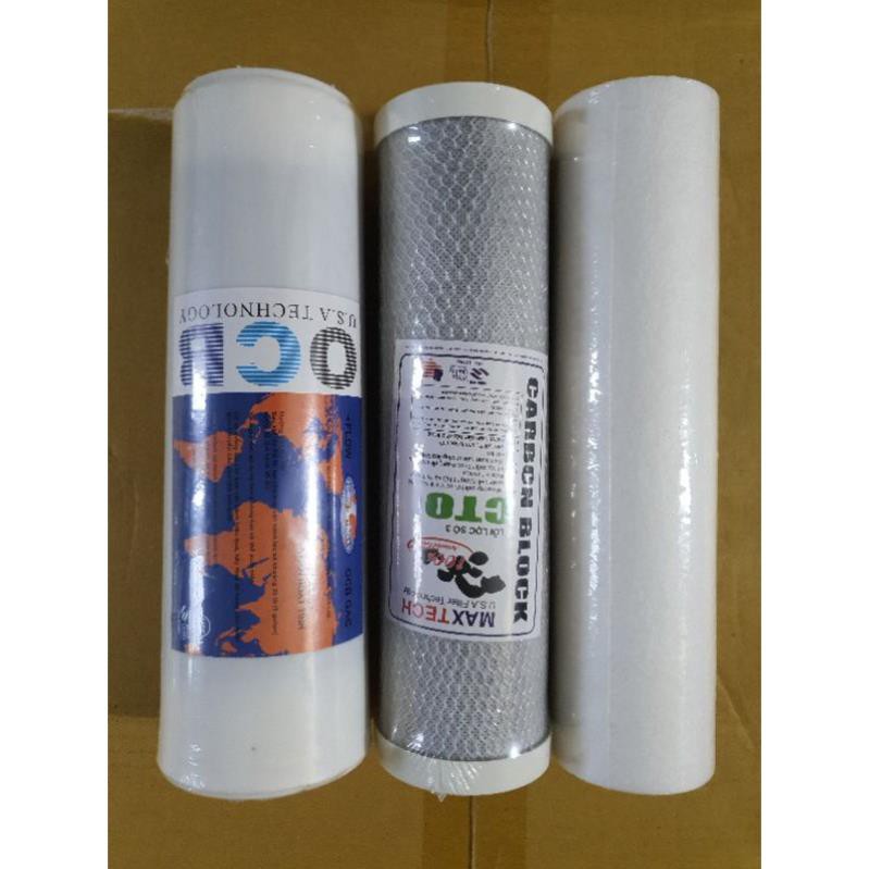 bộ lõi 123 lắp vừa các loại máy lọc nướclõi lọc số 1 - Sợi PP khe hở 5 micron Đây là lõi lọc ở vị trí số 1 trongMáy lọc nước. Ngăn chặn bẩn, bùn đất, rỉ sét có kích thước >= 5 micron. Thời hạn thay lõi số 1: Lõi lọc số 1 (PPE) : Từ 3 – 6 tháng. Trong môi trường nước máy tuổi thọ đạt ~ 4 tháng, còn trong môi trường nước giếng khoan có hàm lượng sắt, đá vôi, man gan…nhiều thì tuổi thọ từ 2 – 3 tháng. Lõi so 2 Nguyên liệu: Sợi PP có khe⁶ lọc 1 micron - Chức năng: Loại bỏ bùn đất, rỉ sét, các loại tạp chất thô, kim loại nặng ... có kích thước > 1 micron - Tuổi thọ: 9 ~ 12 tháng (~ 36.000 lít) Nguyên liệu: Than hoạt tính dạng hạt - Chức năng: Hấp phụ kim loại nặng, chất hữu cơ, chất tẩy rửa, các loại hóa chất độc hại ... Thời gian thay lõi số 2: Lõi lọc số 2 (UDF-GAC) : Từ 6 – 9 tháng. Trong môi trường nước máy tuổi thọ đạt ~8 tháng, còn trong môi trường nước giếng khoan thì tuổi thọ từ 5 -8 tháng Lõi lọc số 3 (CTO) : Từ 9 – 12 tháng. Trong môi trường nước máy tuổi thọ đạt ~10 tháng, còn trong môi trường nước giếng khoan thì tuổi thọ từ 6 – 9 tháng.