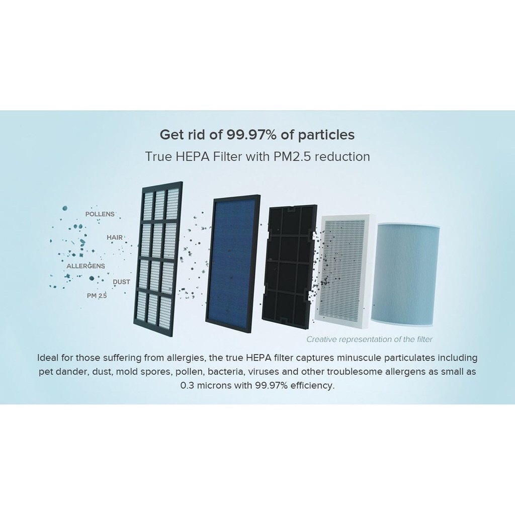 - Lớp thứ hai là bộ lọc HEPA cấp H13 lọc hạt có đường kính 0,3μm trở lên, bao gồm hạt PM2,5, khói, vẩy da thú cưng, phấn hoa và thậm chí cả vi khuẩn gây bệnh(2).