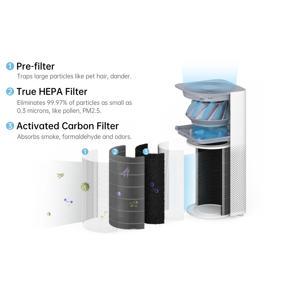 - Lớp thứ hai là bộ lọc HEPA cấp H13 lọc hạt có đường kính 0,3μm trở lên, bao gồm hạt PM2,5, khói, vẩy da thú cưng, phấn hoa và thậm chí cả vi khuẩn gây bệnh(2).