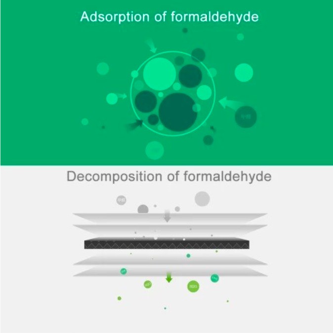 - Lớp cuối cùng được làm bằng than hoạt tính chất lượng cao giúp hấp thụ formaldehyd và các hóa chất độc hại khác, cũng như có thể khử mùi hôi.