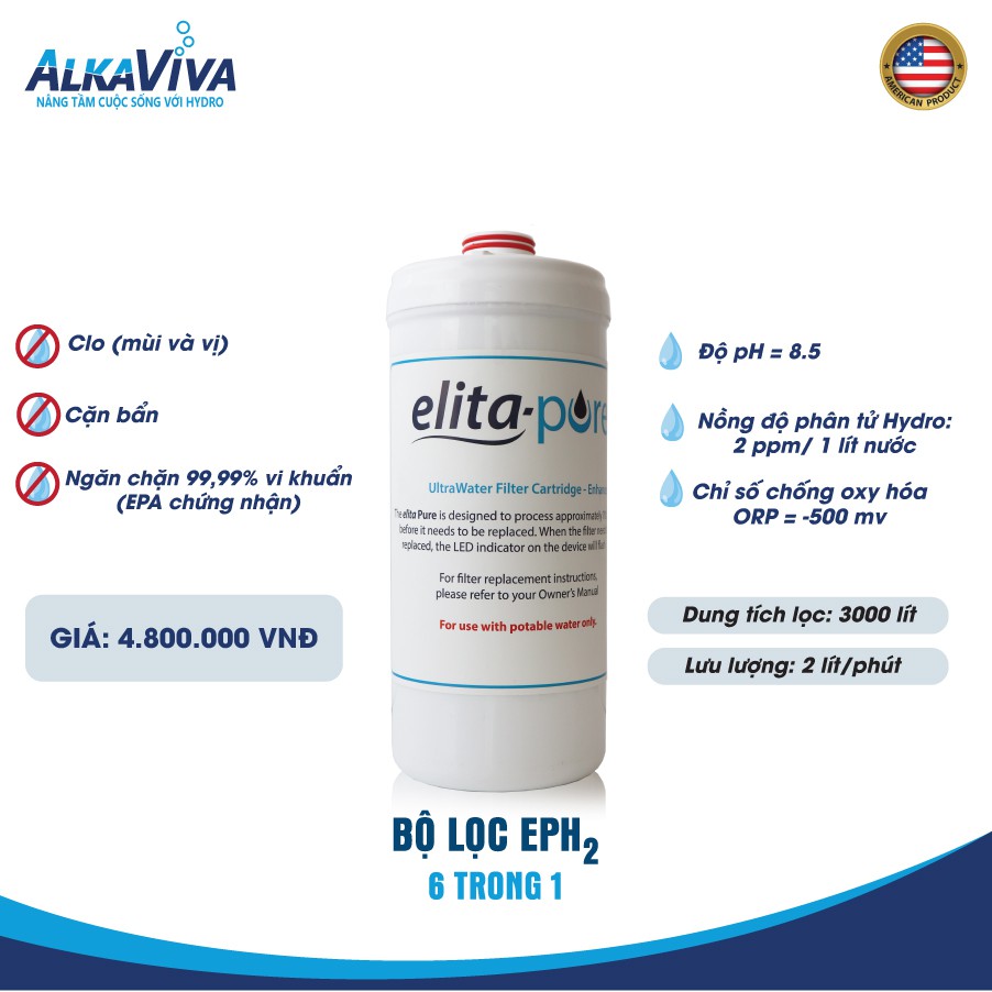 - Elita tăng cường thuộc tính cũng như chức năng lọc, Elita Pure tạo ra mức độ lý tưởng của nước giàu hydro (H2), ion hóa (-ORP) và độ kiềm (pH).