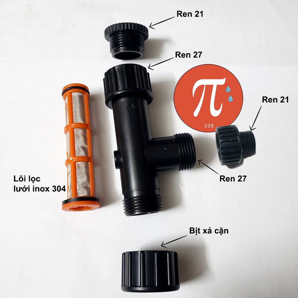 Cục lọc dạng chữ tê. Có lưới lọc Inox 304 lỗ siêu nhỏ.