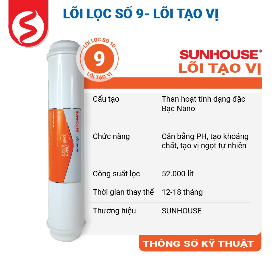 Lõi lọc nước số 9 SUNHOUSE SHRLL9 có chức năng cân bằng pH, tạo khoáng chất; hấp thụ và khử mùi vị, chất hóa học, kim loại nặng; tạo nước kiềm tính trung hòa axit dư thừa trong tế bào.
