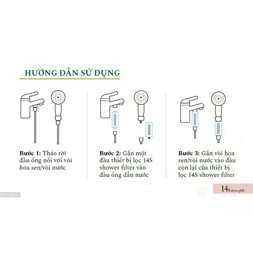 - 14S shower filter có thể lọc 7.500 lít nước, có thể được sử dụng trong khoảng 120-150 ngày. Thời gian sử dụng của mỗi thiết bị lọc phụ thuộc vào áp lực nước, nhiệt độ nước và thời gian sử dụng vòi hoa sen. Khi mùi hương không còn nữa, đã đến lúc thay thế bộ lọc mới.