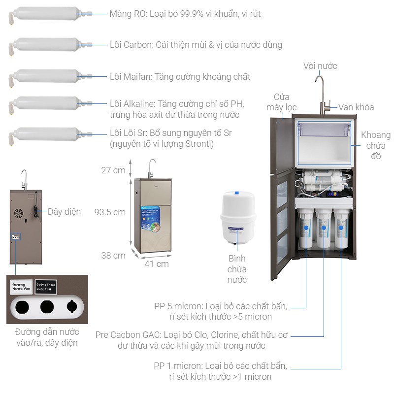 - Lõi số 1: Loại bỏ các tạp chất như bùn đất, gỉ sắt, chì, thạch tín, Mangan.. và các cặn bẩn, vi khuẩn có kích thước lớn hơn 5 micron.