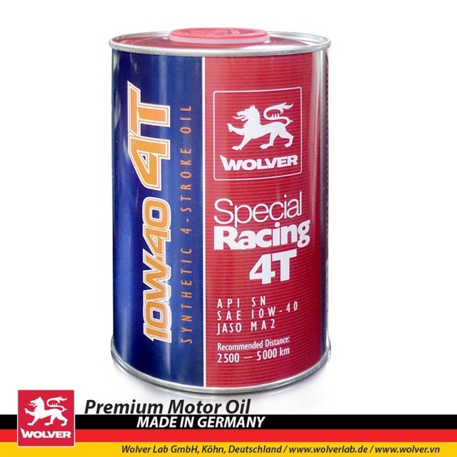 WOLVER SPECIAL RACING là phiên bản đặc biệt của dòng sản phẩm nổi tiếng WOLVER FOUR STROKE RACING sản xuất tại Đức bởi tập đoàn Wolver Lab. Sản phẩm được pha chế dầu gốc tổng hợp với hệ phụ gia thiết kế chuyên dụng cho động cơ xe máy 4 thì, bao gồm cả động cơ xe phân khối lớn, xe số và xe tay ga.WOLVER #SPECIAL #RACING đáp ứng tiêu chuẩn API #SN, độ nhớt SAE #10W40 và có chu kỳ sử dụng khuyến cáo lên đến 5000 km, cung cấp tính năng bôi trơn hoàn hảo, bền bỉ bảo vệ động cơ trong những điều kiện khắc nghiệt, từ các tour đường trường không nghỉ, địa hình đồi dốc cho tới các vùng đồi cát đầy nắng, gió và muối biển. WOLVER SPECIAL RACING luôn là biểu tượng về độ tin cậy trên khắp các hành trình.
