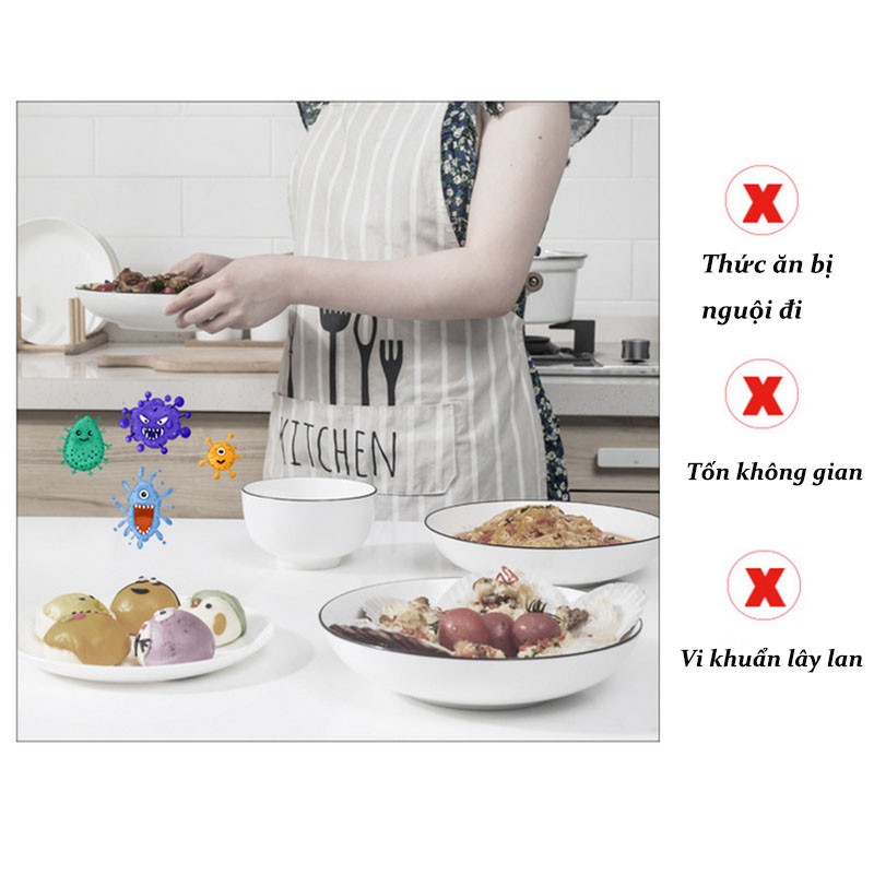 - Thiết kế bề mặt trơn bóng giúp dễ chùi rửa vệ sinh, sản phậm thường dùng để đậy chắn thức ăn không cho cồn trùng như: dán, ruồi, mũi, kiến... xăm nhập vào làm bẩn thức ăn.