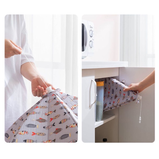 Chỉ với vài thao tác đơn giản là rút dây điều khiển các thanh khung của lồng bàn, toàn bộ chiếc lồng bàn thu lại nhỏ gọn. Điều này giúp tiết kiệm không gian bày biện đồ đạc nhất là đối với những gian bếp nhỏ hẹp không thể chứa nhiều dụng cụ.
