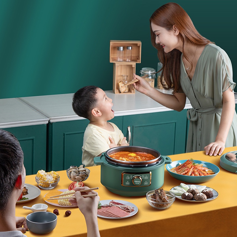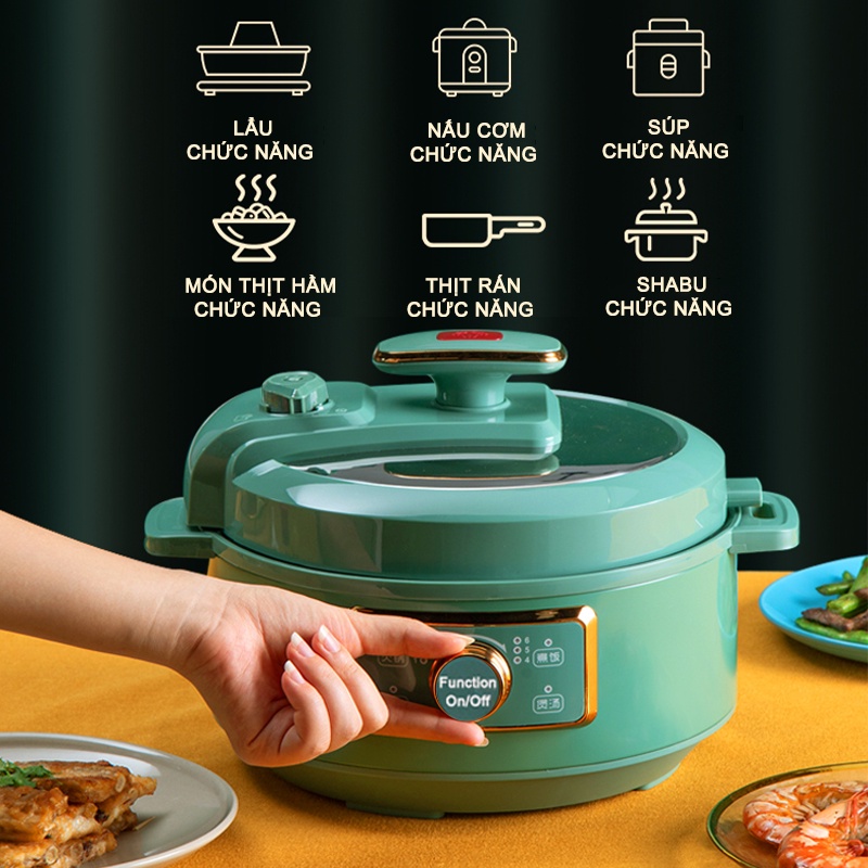 • Chức năng: Nấu lẩu, hầm, chiên, xào, rán..., nồi áp suất, nấu cơm, nấu mọi loại thức ăn đều được.