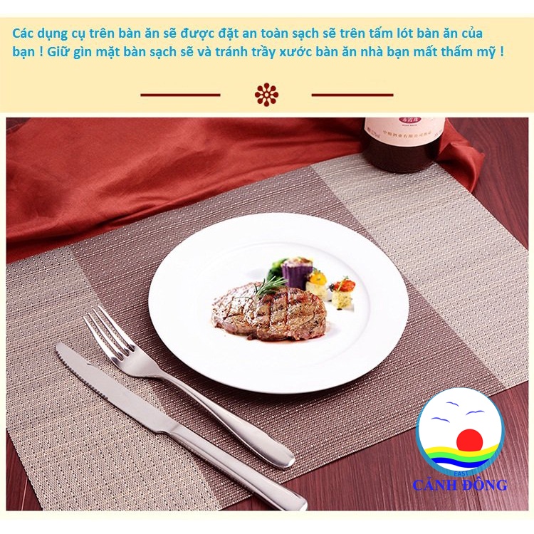 Các dụng cụ trên bàn ăn sẽ được đặt an toàn, vệ sinh trên Tấm lót bàn ăn cách nhiệt pvc chống trơn trượt của bạn! Chúng giúp mặt bàn luôn sạch sẽ và tránh trầy xước để giữ bàn ăn của bạn luôn đẹp như mới. Đây chắc chắn là sản phẩm vô cùng thích hợp để bạn dùng trang trí bàn ăn nhà hàng, hội nghị, tiệc hay kể cả những bữa ăn ấm cúng cùng gia đình.