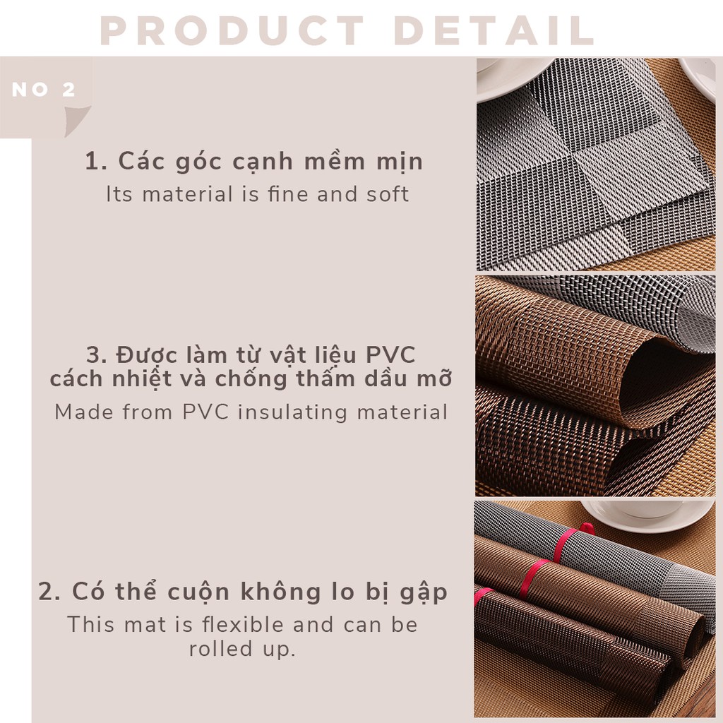 - Những tấm lót trang, sáng tạo và đơn giản. Phù hợp với tất cả món ăn. Khả năng chống thấm, dễ dàng làm sạch, phù hợp với mọi không gian bàn ăn
