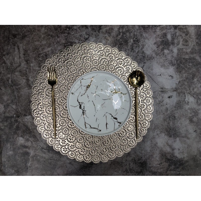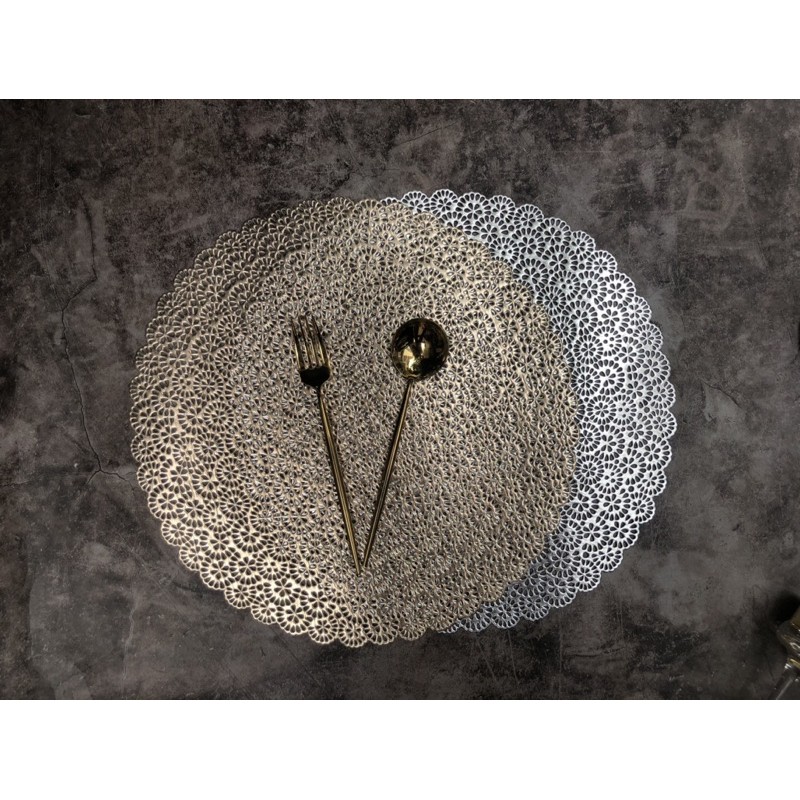 Tấm lót bàn ăn, lót lọ hoa, placemat, nhựa dẻo màu bạc và vàng, đường kính 38cm, xinh, rẻ, tiện lợi