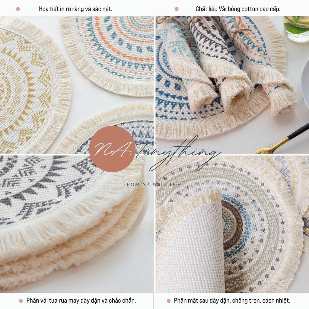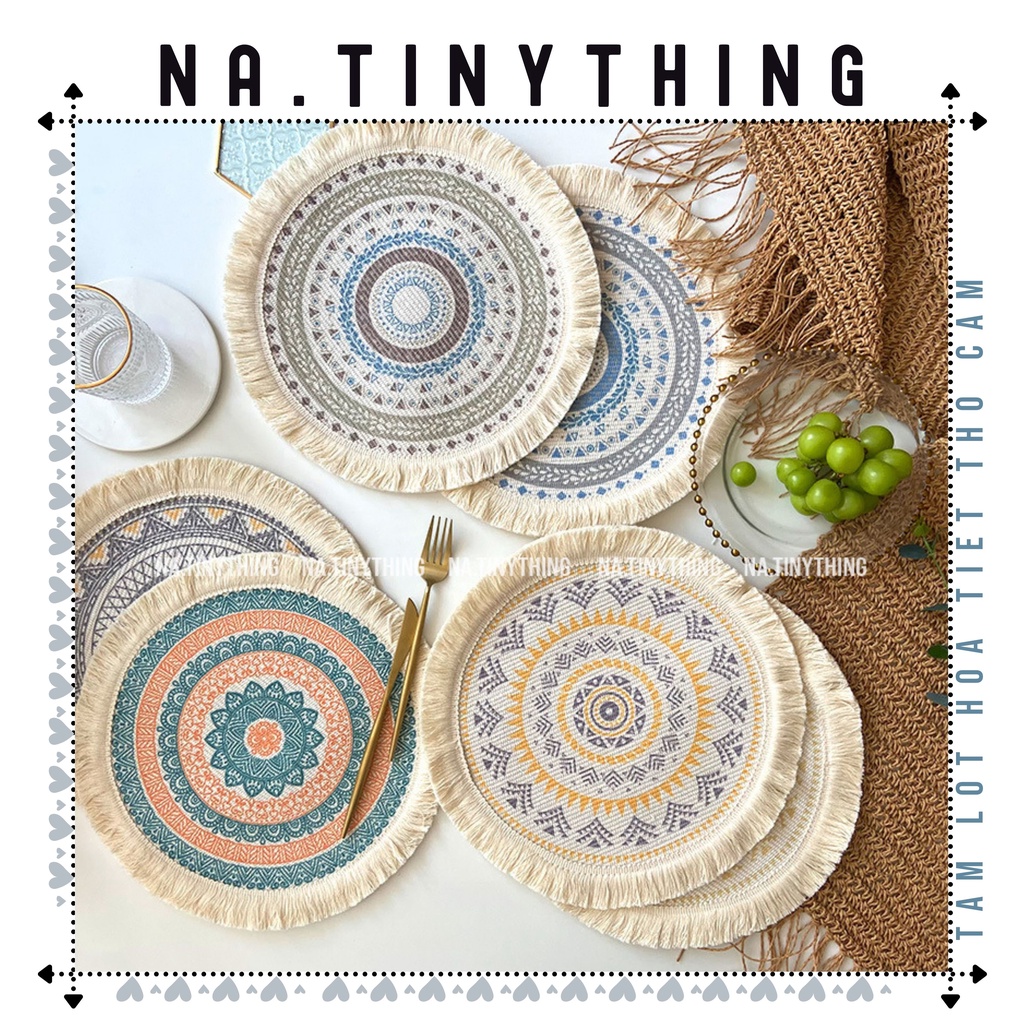 Giới thiệu Tấm lót bàn ăn, miếng lót bình hoa, đế lót tròn hoạ tiết thổ cẩm phong cách Bắc Âu Boho Bohemian NA0057