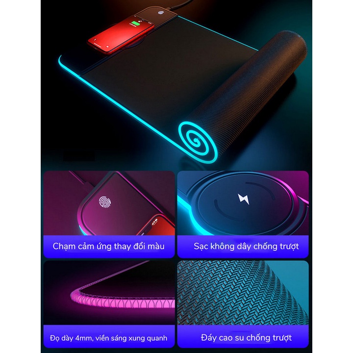 ĐẶC ĐIỂM NỔI BẬT :- Chức năng tấm lót bàn làm việc, lót chuột tích hợp sạc nhanh không dây, tích hợp đèn viền trang trí đổi màu linh hoạt