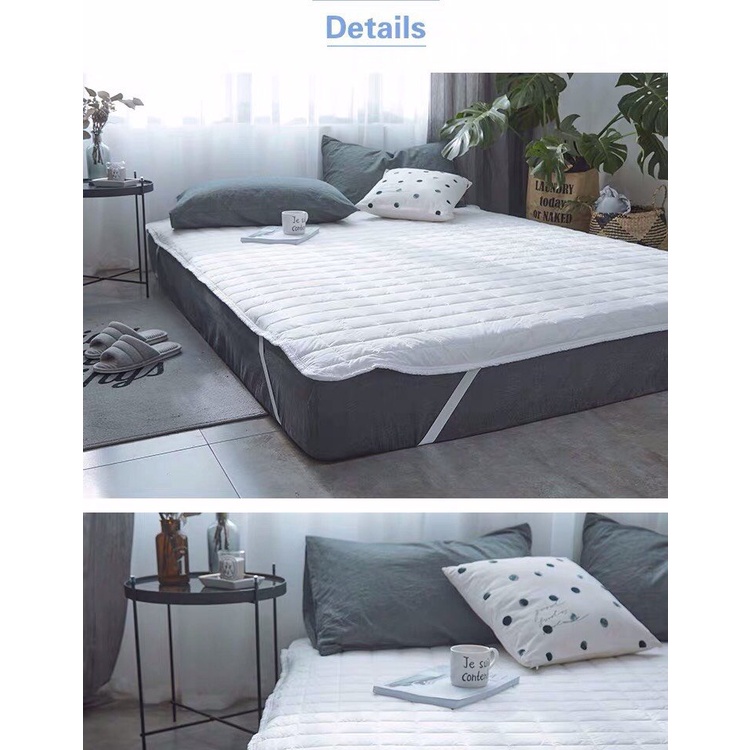 - 04 góc được may dây thun để bọc vào 4 góc nệm tấm lót được cố định khi mặc vào nệm,