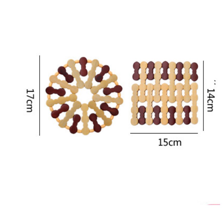 ** lót gỗ có 2 mẫu: hình vuông, hình tròn** Kích thước: hình tròn đường kính 17cm, hình vuông 14x15cm.