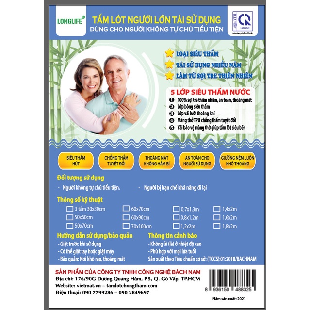 I. Tên gọi: Tấm lót chống thấm cho người già LONGLIFE size 50x70cm- Tấm lót chống thấm cho người già/miếng lót chống thấm cho người lớn LONGLIFE là tấm lót 5 lớp sợi tre cao cấp lần đầu tiên và duy nhất được sản xuất tại Việt Nam bởi Công ty TNHH Bách Nam (TP.HCM):