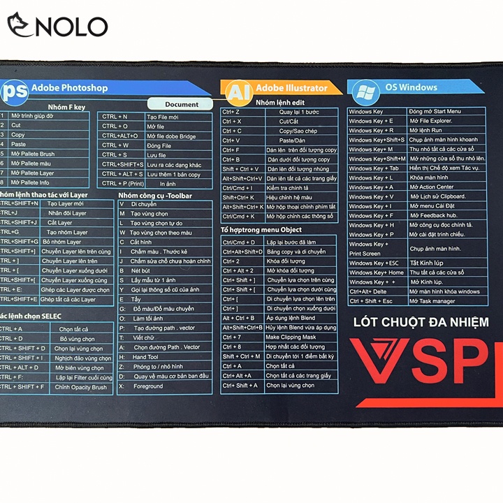 Lót Chuột Bàn Di Chuột VSP 185 Phím Tắt Kích Thước 30x80cm Dày 3 Ly Bề Mặt In 3D Không Phai Lệnh Của Office, Powerpoint, Excel, Word, PS, AI, WindowsGiới thiệu: