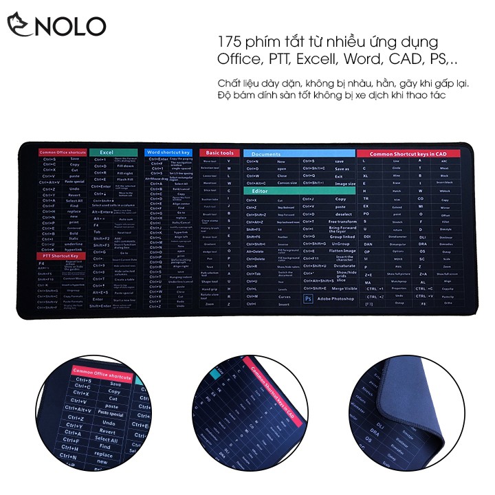 Giới thiệu Lót Chuột Padmouse Lớn Kích Thước 30x80cm Dày 3 Ly Bề Mặt In 3D Không Phai 175 Phím Tắt Của Office, Word, Photoshop
