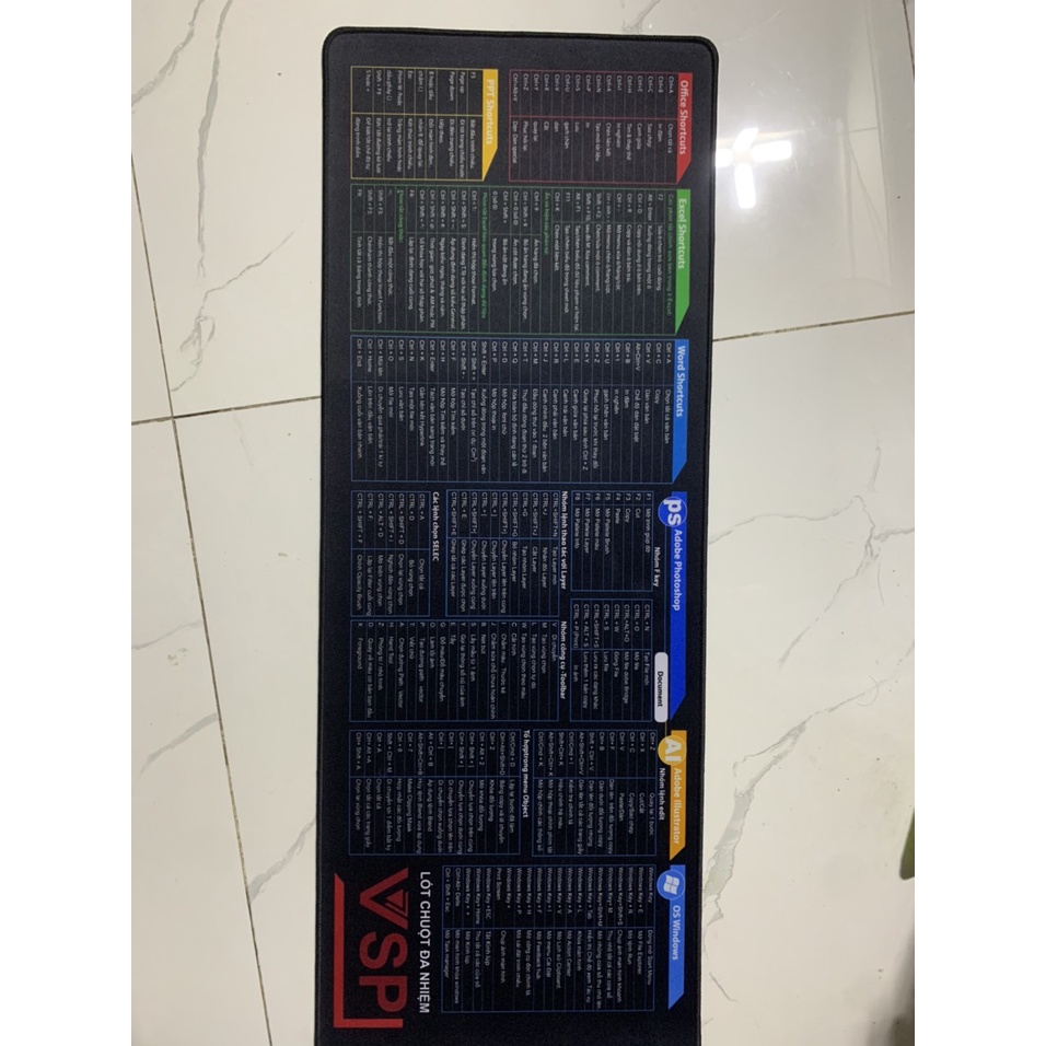Thông tin của sản phẩm: - Kích thước: 80x30x0.3cm - Chất liệu: Đế cao su tổng hợp, trên là lớp vải trơn, may viền chắc chắn giúp giảm ma sát tăng tốc độ di chuột - Lót chuột in phím tắt các công cụ của Office như Word, Excel, Power Point thuận tiện cho dân văn phòng, ngoài ra còn có phím tắt cho Photoshop, Autocad cho dân thiết kế, kỹ thuật - Ngôn ngữ trình bày chức năng phím tắt đã được Việt hóa dễ hiểu - Lót chuột vừa giúp trang trí bàn làm việc đẹp hơn, vừa giúp các bạn lưu công thức cực tiện lợi thuận tiện khi làm việc#bandichuot #mieng #mienglotchuot