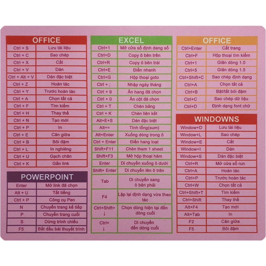 Máy tính & Laptop > Phụ Kiện Máy Tính > Bàn Di Chuột || Lót chuột phím tắt văn phòng (Bản Việt Hóa) Excel, Office, Powerpoint kích thước 26x21cm cực tiện dụngCòn hàng