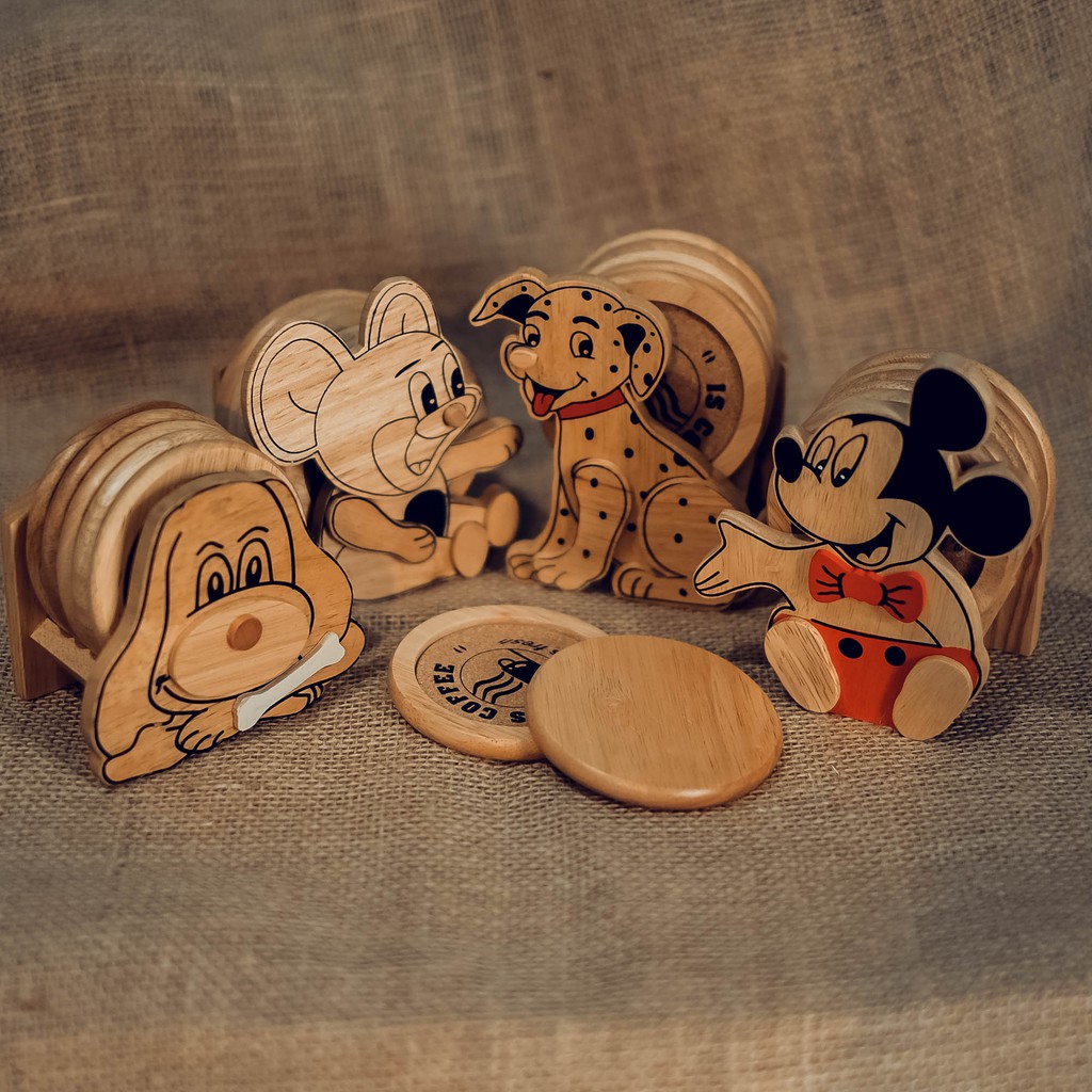 Bộ Lót Ly gỗ 6 cáiVới bộ sản phẩm Có kiểu dáng nhỏ gọn, hình các nhân vật hoạt hình đáng yêu