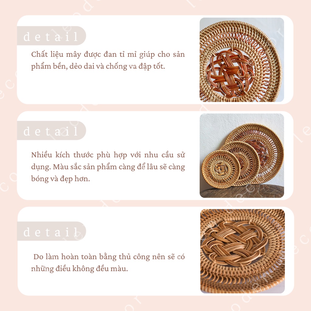 - Đế lót ly bằng mây đan được làm thủ công từ những bàn tay của các nghệ nhân lành nghề của làng nghề thủ công Việt Nam một cách tỉ mỉ cẩn thận.