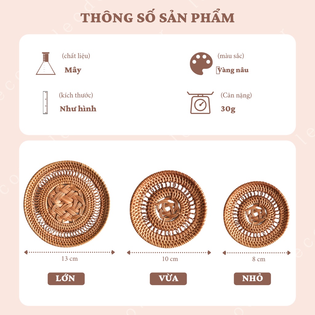 Giới thiệu Lót ly, lót cốc bằng mây guộc hình hoa nhiều kích thước, đế lót ly mây làm phụ kiện chụp ảnh decor -LEODEN DECOR