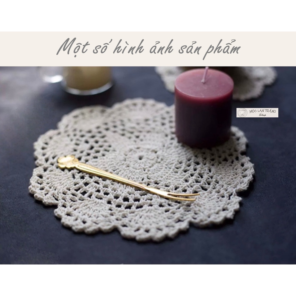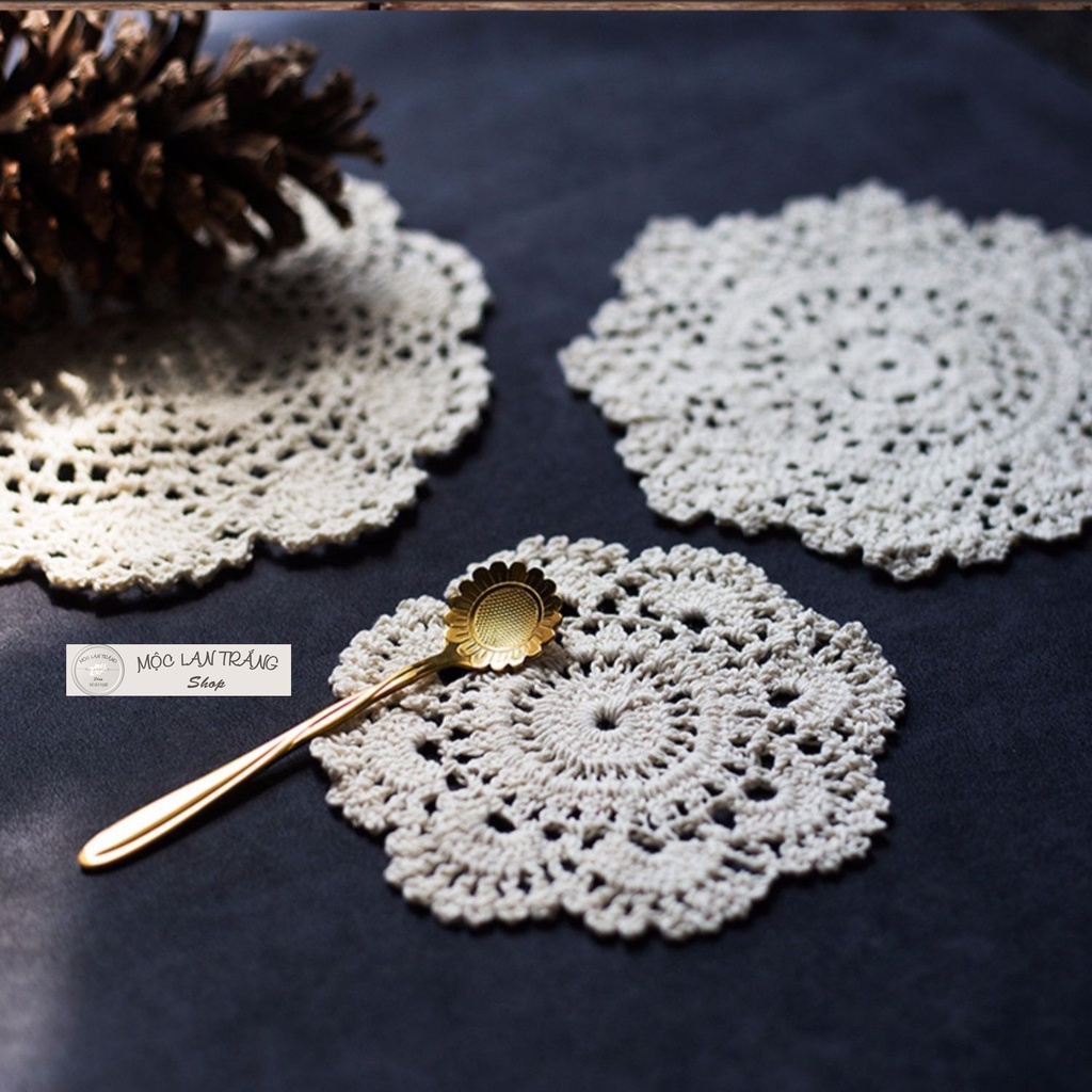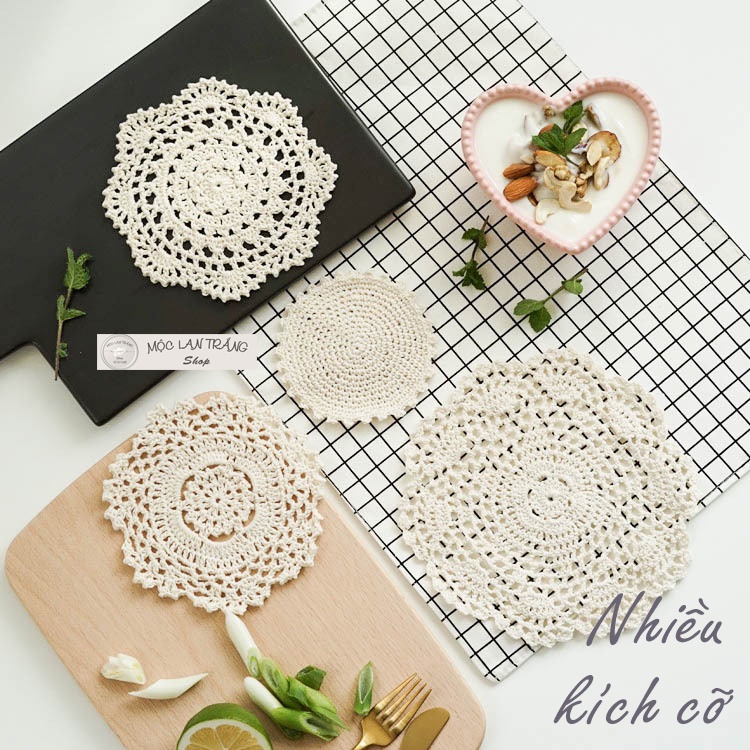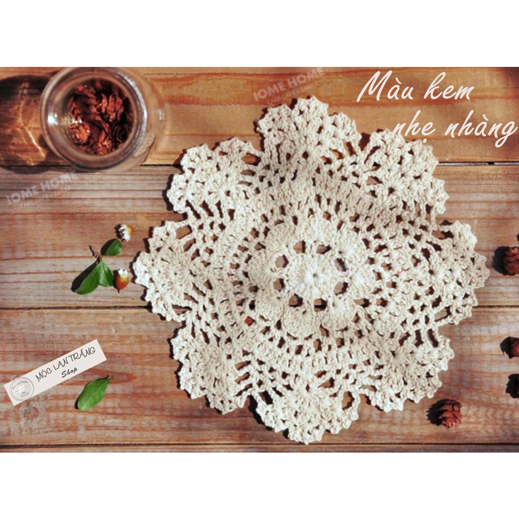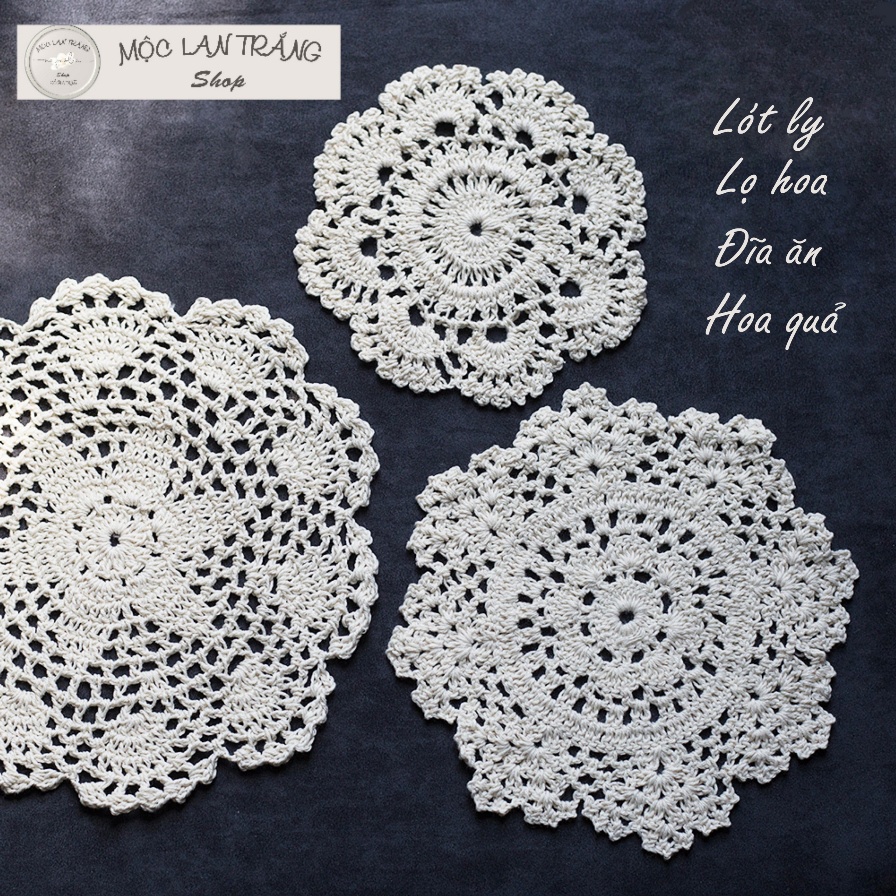 Giới thiệu Lót ly lót cốc len móc thủ công hình hoa nhiều kích cỡ, tấm lót bình lọ hoa dĩa ăn đĩa hoa quả đa năng màu kem trang trí