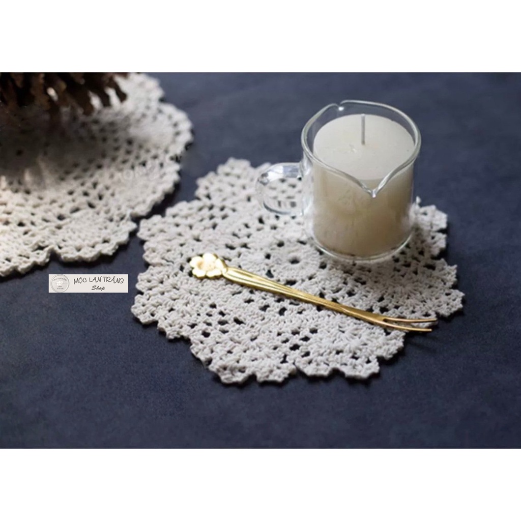 Lót ly lót cốc len móc thủ công hình hoa nhiều kích cỡ, tấm lót bình lọ hoa dĩa ăn đĩa hoa quả đa năng màu kem trang trí