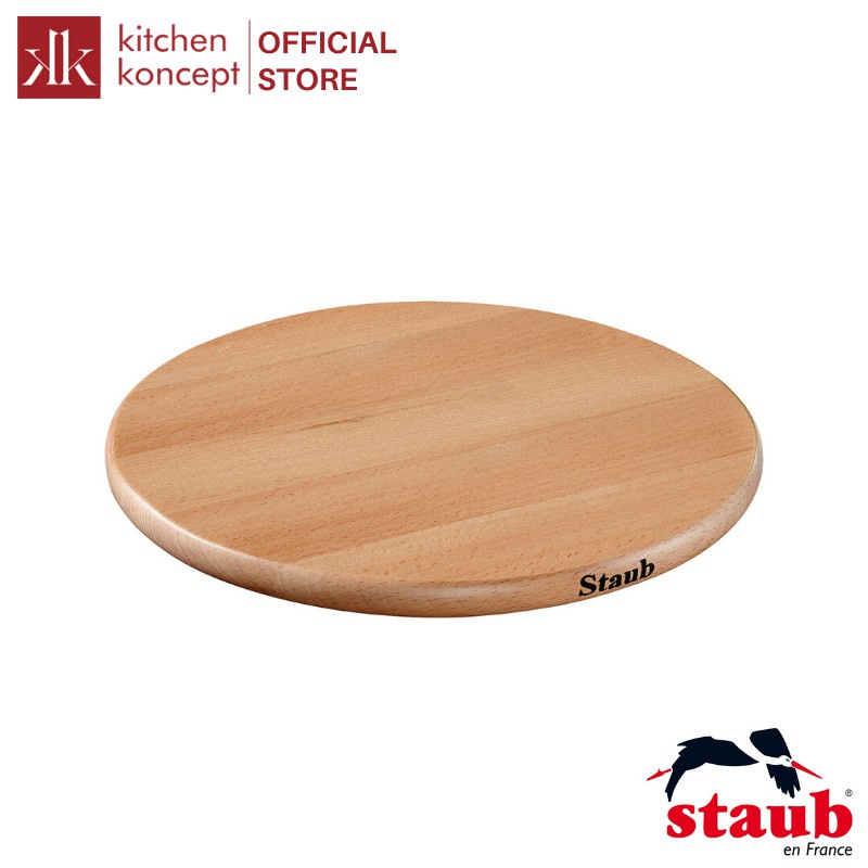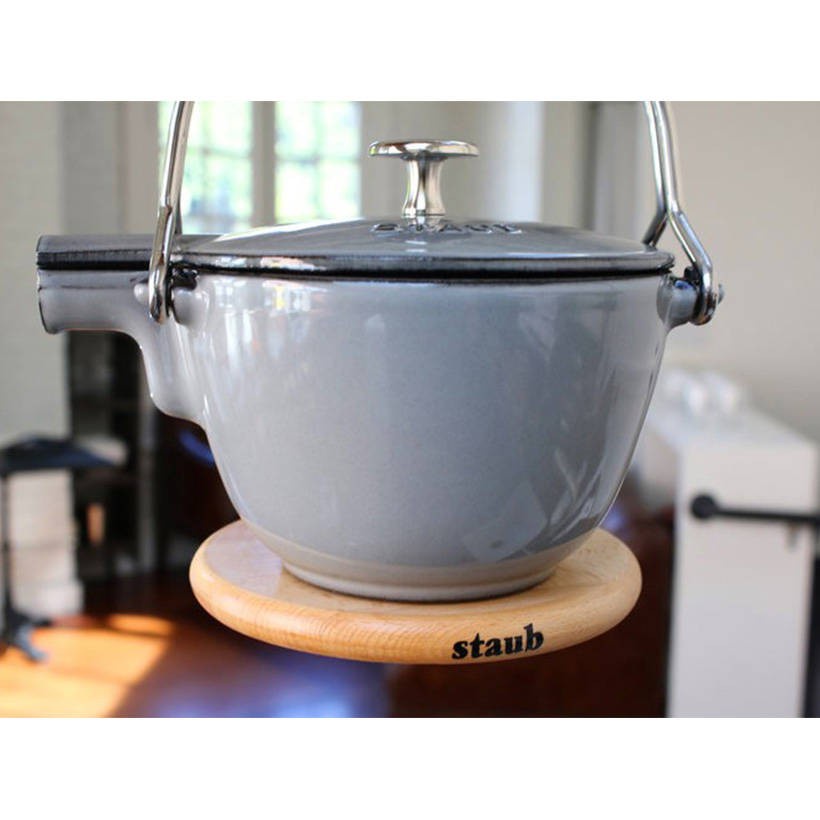 - Lót nồi Staub bằng gỗ có gắn nam châm, bảo vệ đáy nồi, giúp chuyển nồi từ thẳng lò nướng lên bàn ăn một cách dễ dàng.