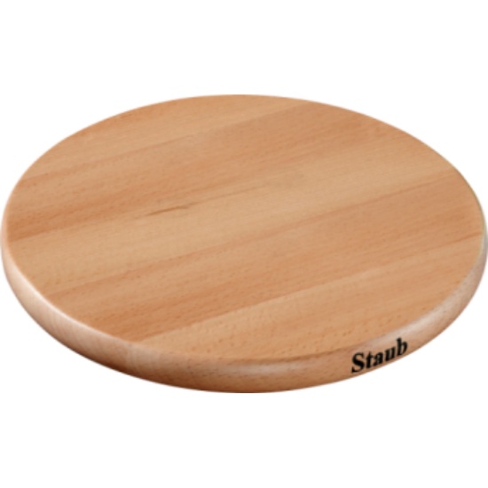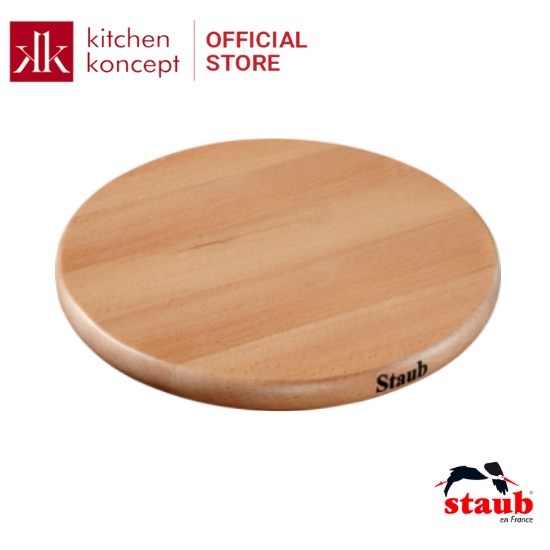 - Lót nồi Staub bằng gỗ có gắn nam châm, bảo vệ đáy nồi, giúp chuyển nồi từ thẳng lò nướng lên bàn ăn một cách dễ dàng.