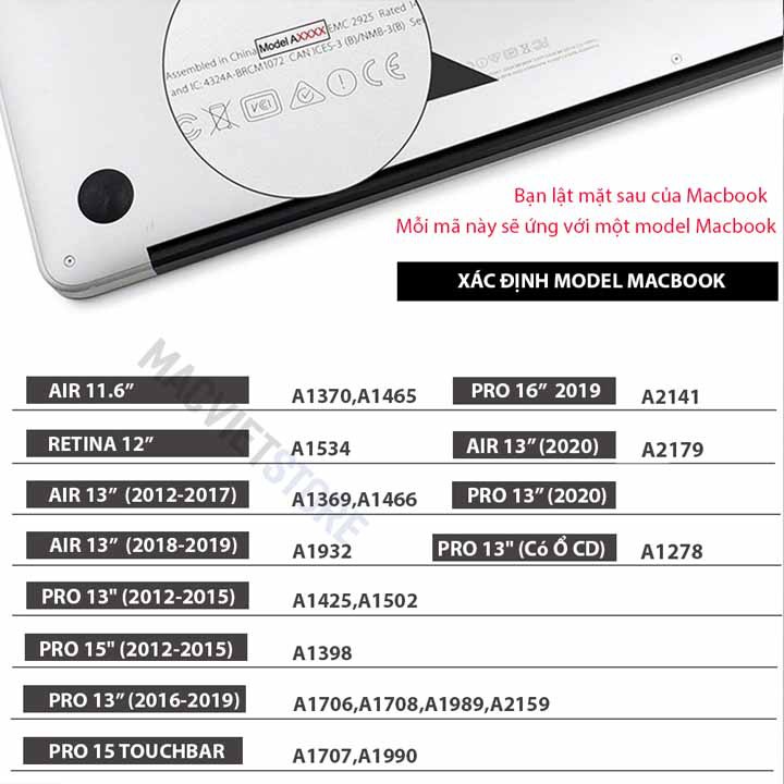 📌 Không phải lót phủ nào cũng dùng chung được cho nhau nên các bạn giúp shop chọn đúng phân loại bằng cách lật mặt sau của máy ( Hai dòng chữ nhỏ trên cùng ) để xem Model A1466,A1502,A1534 ... để chọn sản phẩm
