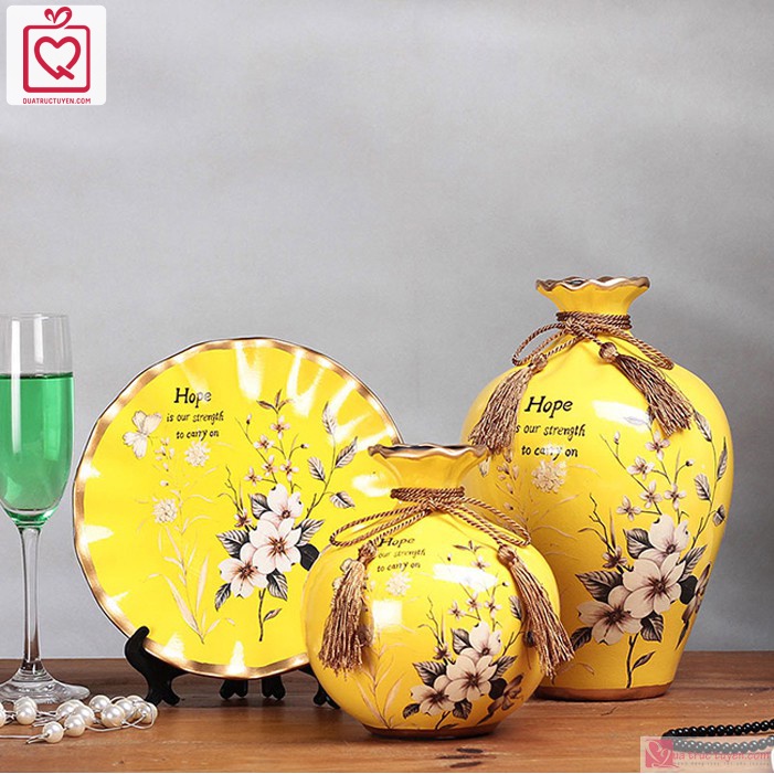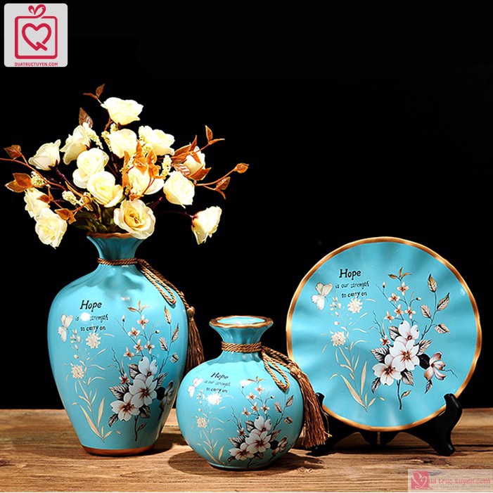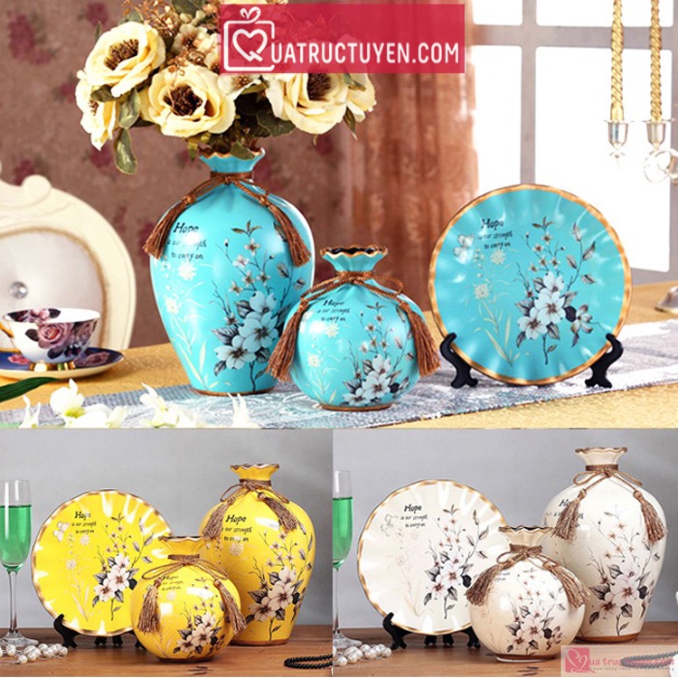 Bộ lục bình tranh đĩa gốm sứ hoa anh đào 25cm (trắng/vàng/xanh)