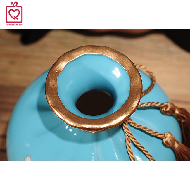 - Cổ bình được điểm nhấn bằng sợi dây nơ góp thêm phần ấn tượng và sang trọng.
