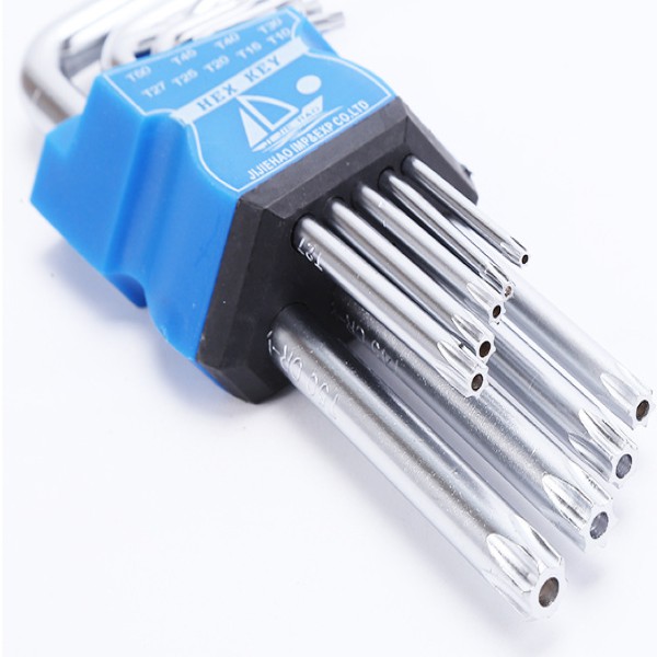 Và chúng tôi xin giới thiệu với bạn bộ lục giác 9 cây đầu bông mai với kích thước từ T9 đến T40. Bộ lục giác này được chế tạo bằng thép S2, là loại thép chuyên dùng để chế tạo lục giác, vì có độ bền cao, chịu lực tốt.
