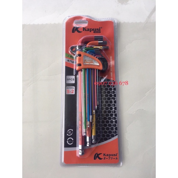 Giới thiệu Bộ Lục Giác 9 Màu Đầu Bi Hãng Kapusi Nhật Bản Cao Cấp, 9 Cây Chữ L 1.5-10mm, Chất liệu thép CR-V6150