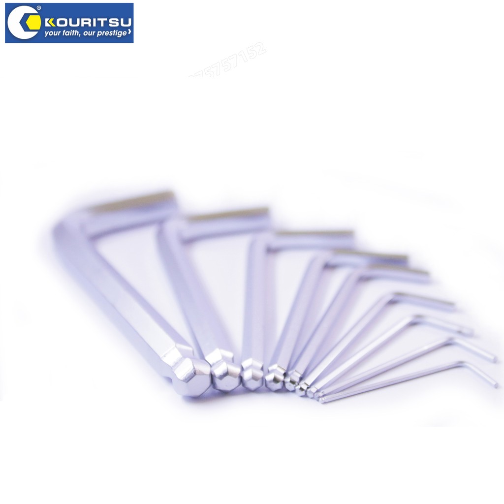 Bộ lục giác bi, hoa thị ngắn ngắn Nhật Bản Kouritsu T04403, T04405 được công nhận chuẩn ANSI về chất lượng. Được tin dùng trên nhiều quốc gia trên thể giới.Trên mỗi cây lục giác có ghi sẵn kích thước cho bạn thao tác nhanh chóng. Mỗi cây lục giác được mạ Crom vanadium nên không bị rỉ sét, xước xát khi sử dụng trong thời gian dài