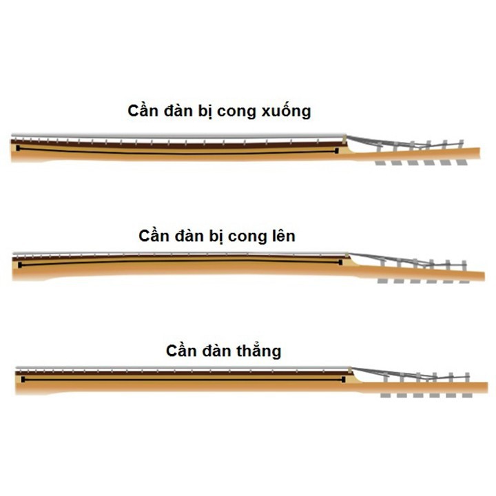 - Sau 1 thời gian sử dụng lâu, cần đàn Guitar có xu hướng bị CONG HÌNH VÕNG do lực căng của dây tác động vào cần đàn. Lúc này, ta sử dụng lục giác gắn vào ty và xoay theo CÙNG CHIỀU KIM ĐỒNG HỒ và liên tục kiểm tra xem cần đàn đã thẳng lại chưa.