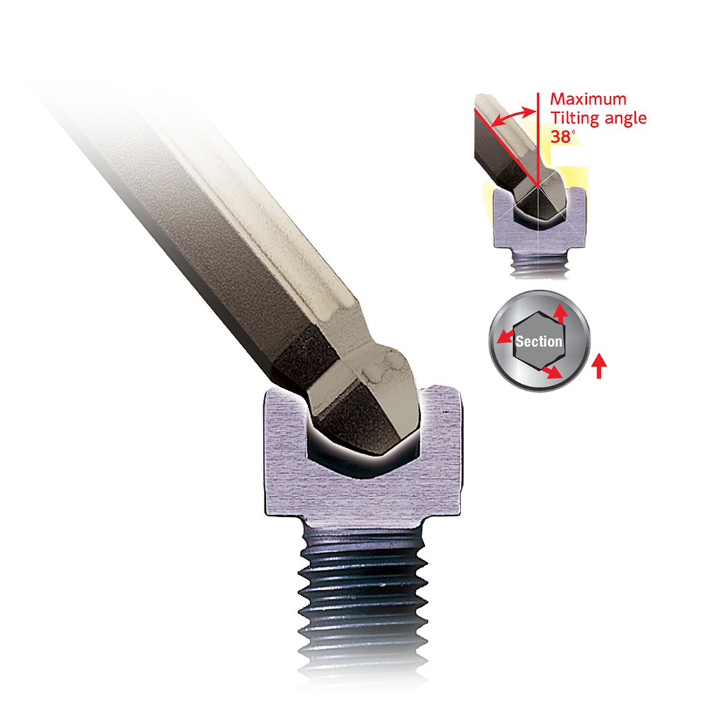 - Đầu vặn được tiết kế hình cầu, có thể vặn vít với góc nghiêng tới 38 độ (đây là điểm đặc biệt của lục giác Vessel), rất phù hợp trong không gian làm việc chật hẹp.