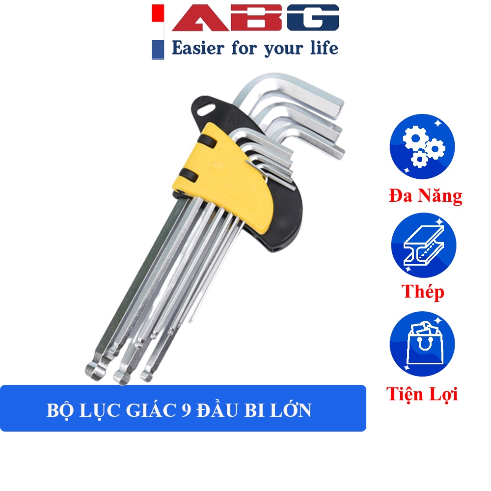 Bộ Lục Giác Đầu Bi Chính Hãng ABG 9 Cây Cao Cấp là sự kết hợp gồm 9 cây lục giác chất liệu thép không gỉ, tương ứng 9 kích cỡ khác nhau nằm gọn gàng trên cùng 1 dụng cụ rất thuận tiện khi sử dụng lại bảo đảm khi cất giữ với kích cỡ, kiểu dáng đa dạng là lựa chọn hoàn hảo để sửa chữa trong việc tháo, lắp ghép bulong đai ốc