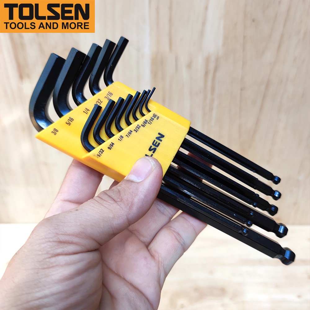 - Bộ lục giác đầu bi Tolsen 20090 gồm 13 cây với các kích cỡ khác nhau: 0.05“-1/16”-5/64“-3/32”-7/64“-1/8”-9/64“-5/32”-3/16“-7/32”-1/4“-5/16”-3/8“